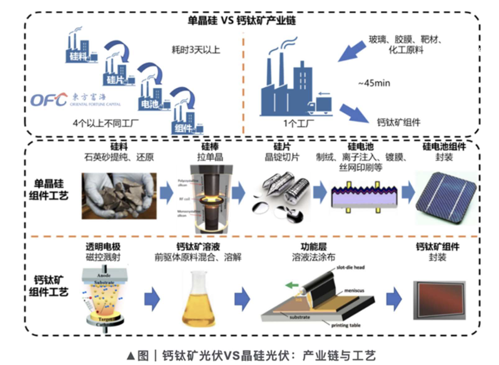 钙钛矿目前尚处于从0到1的产业化初期,相比晶硅太阳能电池其产业链更短,仅包含原材料加工、功能层制备、组装三个环节,产业链长度缩短一半。除了产业链生产速度快,更能实现一体化生产,省去产业链上下游传递过程中的利润价差。