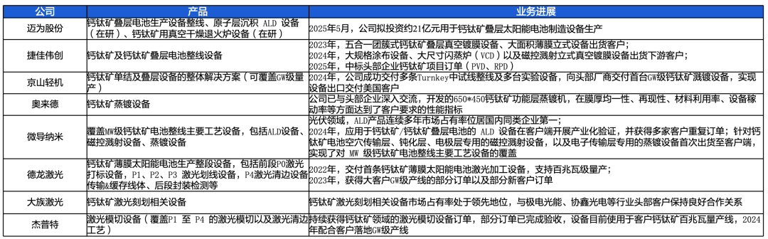 镀膜设备:用于制备电池的各个功能膜层,如TCO层、空穴传输层、电子传输层等。包括PVD(物理气相沉积)、RPD(反应等离子体沉积)以及ALD(原子层沉积)等。捷佳伟创(全球领先的光伏设备供应商,提供RPD等镀膜设备)、京山轻机(覆盖GW级量产的钙钛矿单结及叠层设备整体解决方案),以及微导纳米、理想晶延等。