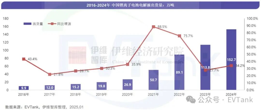 今年2月,研究机构EVTank联合伊维经济研究院共同发布了《中国锂离子电池电解液行业发展白皮书(2025年)》。数据显示,在储能电池的带动下,全球锂离子电池电解液出货量达到166.2万吨,同比增长26.7%。2024年,中国锂离子电池电解液出货量为152.7万吨,同比增长34.2%,且中国电解液出货量的全球占比继续提升90%以上。