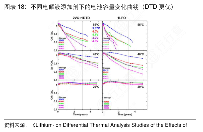 2)储能系统:储能系统要求电池具有长循环(>10000 圈)和低成本的特点。储能磷酸铁锂电池通常添加4%-6%的VC和0.5%-3%的DTD(硫酸乙烯酯),以抑制容量衰减并降低自放电率。