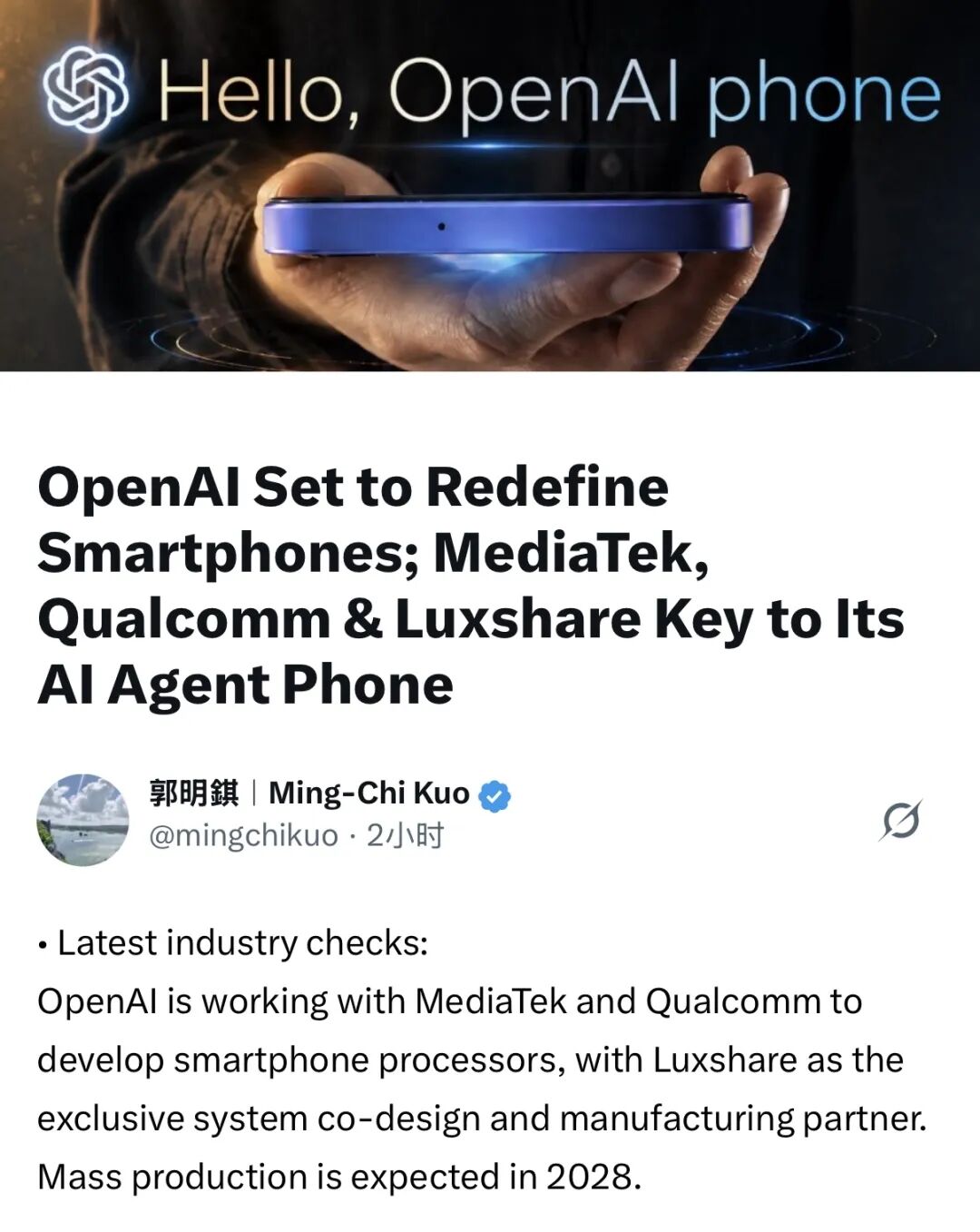 4月27日,天风国际证券分析师郭明錤发文称,OpenAI计划自研手机,正与联发科、高通合作开发手机处理器,立讯精密为独家系统协同设计与制造商,预计2028年量产。