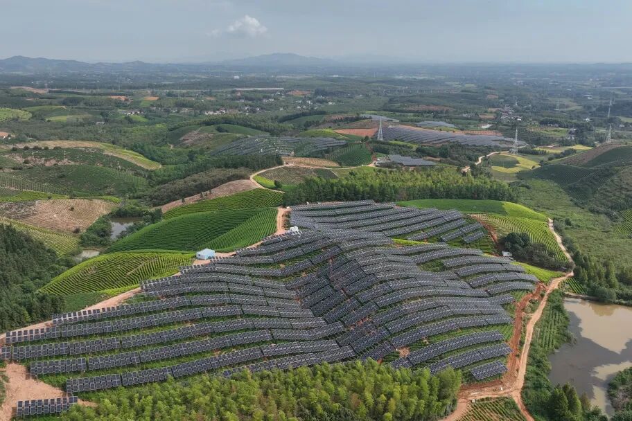 作为全国首个大面积山地集中式“茶光互补”项目,华电新能安徽公司广德茶光互补项目,创新“板上发电、板下种茶”立体模式,租用茶地2684亩,总装机100MW。