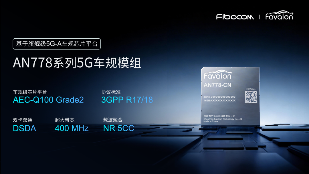 广通远驰5G-A车规级模组AN778基于MediaTek 天玑汽车联接平台 MT2739 开发(四核Cortex-A55,CPU 25K DMIPS),支持400MHz带宽、NR 5CC,下行速率峰值9.8Gbps、上行速率峰值 1.875Gbps,率先在模组侧完成 DSDA 3TX(双卡双通)通信能力验证,为车载多网融合与高阶智驾筑牢通信底座。