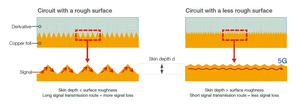 粗糙的铜表面会迫使电流路径变长、变曲折,并产生寄生电感,显著增加高频下的电阻和损耗。使用更光滑的铜箔(如HVLP)可以降低该损耗。