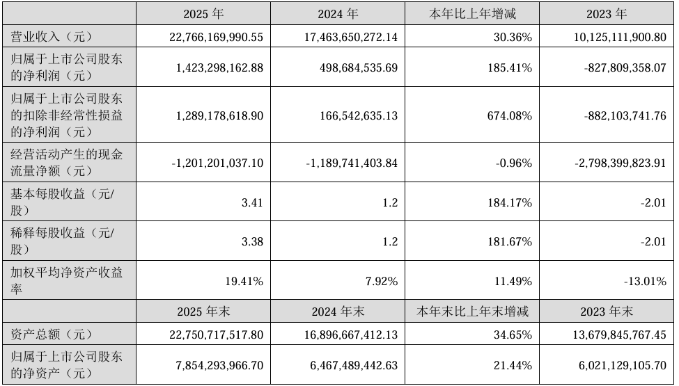 4月28日,深圳市江波龙电子股份有限公司(301308)正式发布2025年年度报告。年报显示,2025年江波龙实现营业总收入227.66亿元,同比增长30.36%;归属于上市公司股东的净利润14.23亿元,同比增长185.41%;归属于上市公司股东的扣除非经常性损益的净利润12.89亿元,同比增长674.08%