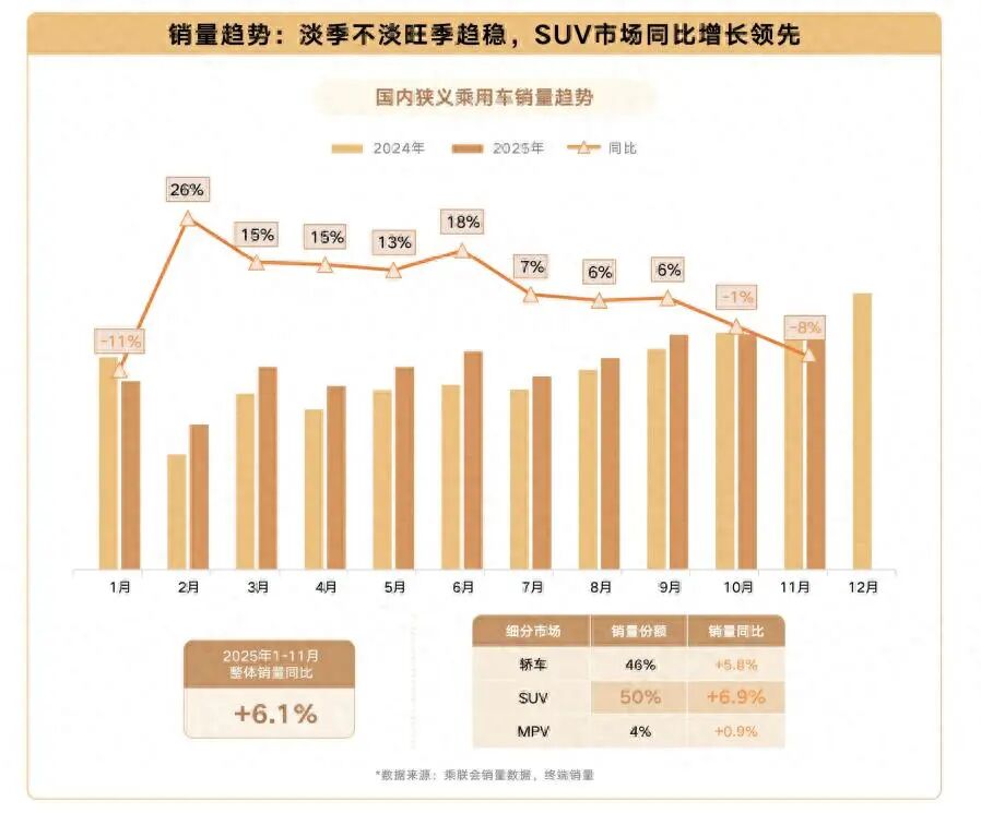 1-11月累计销量同比增长6.1%,从趋势上看,传统淡季销量同比增幅显著,而"金九银十"旺季增速相对平缓,年底出现下滑迹象,在燃油车加速萎缩、新能源补贴政策临期的多重因素影响下,构成了25年销量走势。