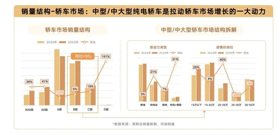 另一方面,B级与C级轿车市场在电动化与消费升级的双重推动下增长强劲,尤其在20-25万价区表现突出。该市场已从传统的燃油主导转向"纯电 插混"并行。