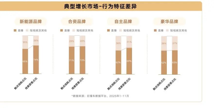 从行业趋势角度看,25年购车意向用户倾向于把有限精力聚焦于部分典型触点上,其中对直播的关注程度增长最显著,直播成为助力用户决策的重要触点。
