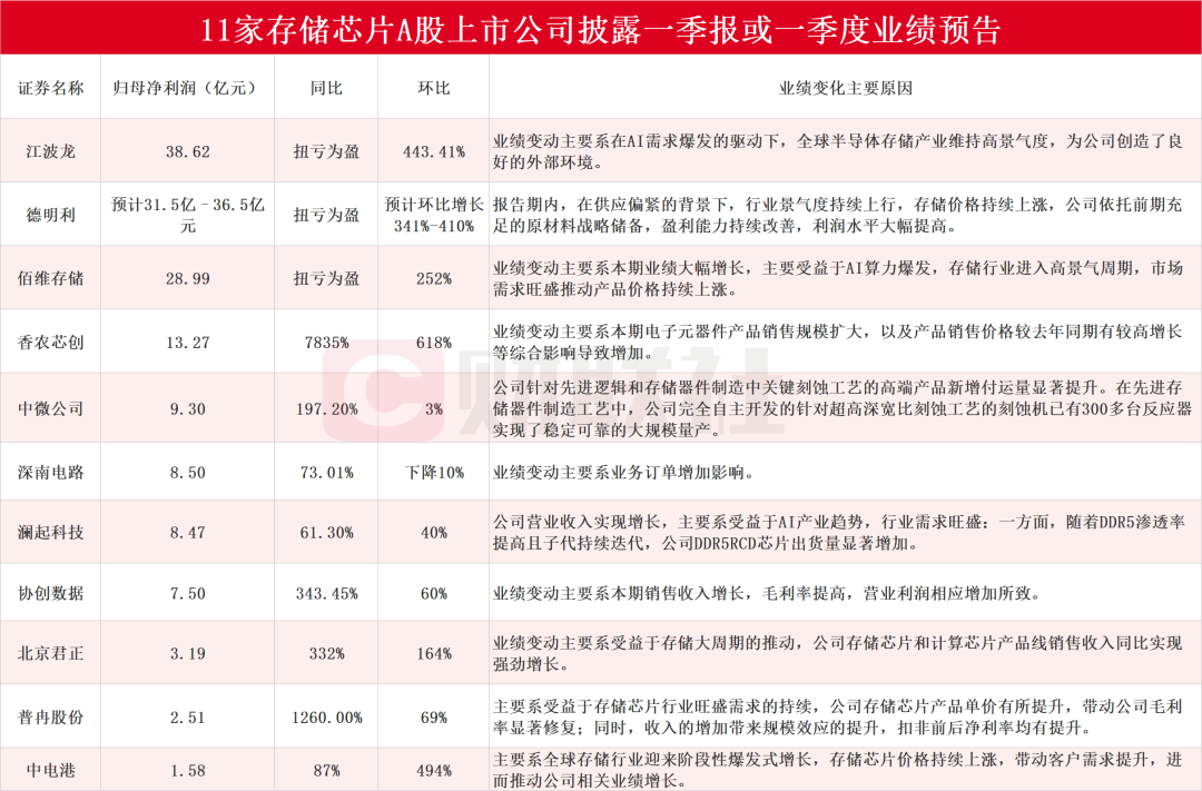 据财联社不完全统计,截至发稿,包括江波龙、德明利、佰维存储、香农芯创、中微公司、深南电路、澜起科技、协创数据、北京君正、普冉股份、中电港在内的多家存储芯片上市公司披露一季报或一季度业绩预告。