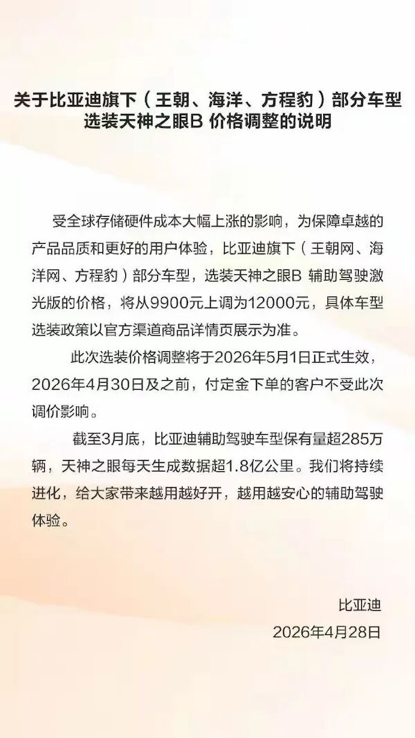 4月28日,比亚迪官宣旗下多款车型涨价。官方说明中提到,受全球存储硬件成本大幅上涨的影响,比亚迪旗下(王朝网,海洋网,方程豹)部分车型,选装天神之眼B辅助驾驶激光版的价格,将从9900元上调为12000元。此次选装价格调整将于2026年5月1日正式生效,2026年4月30日及之前,付定金下单的客户不受此次调价影响。