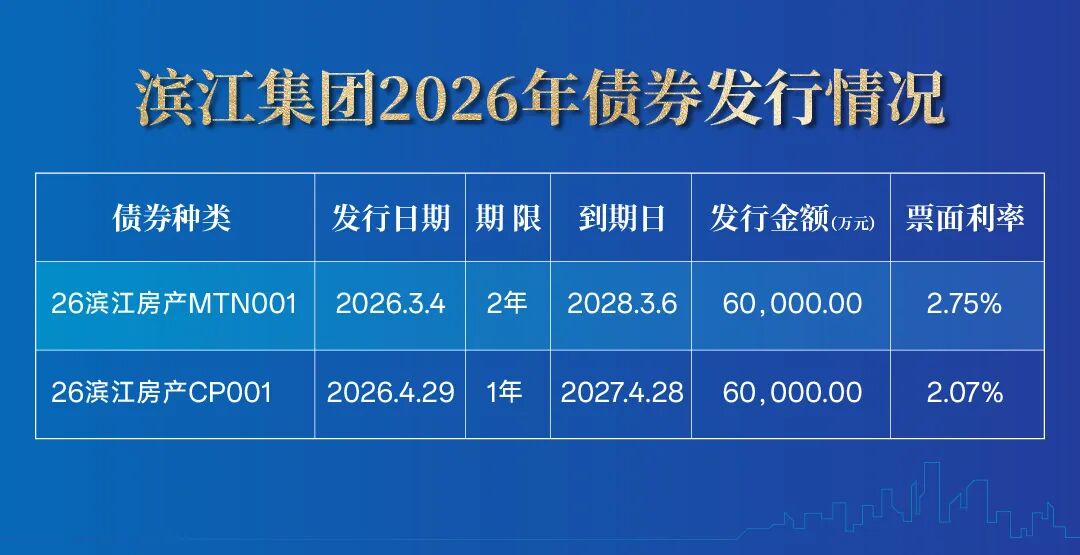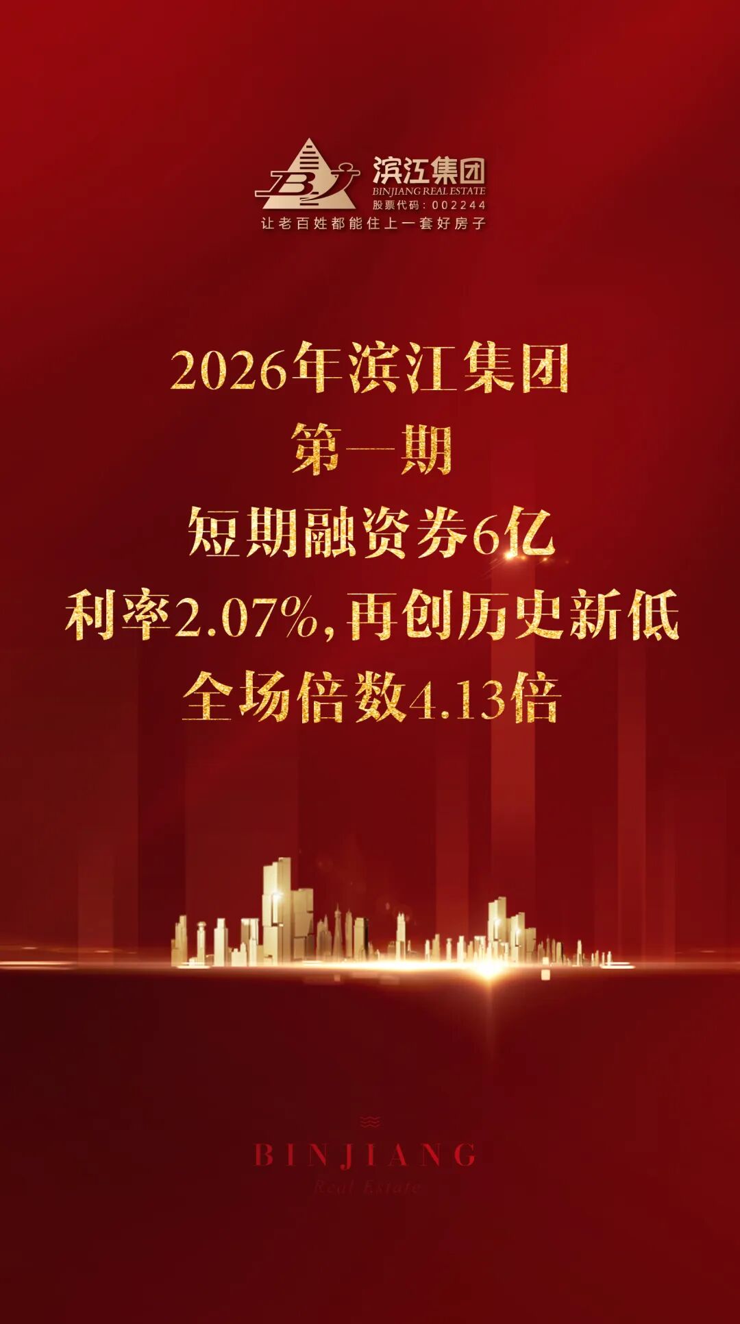 2026年4月28日,滨江集团成功发行2026年度第一期短期融资券,规模为人民币6亿元,发行利率2.07%,再创历史新低,全场认购倍数4.13倍。