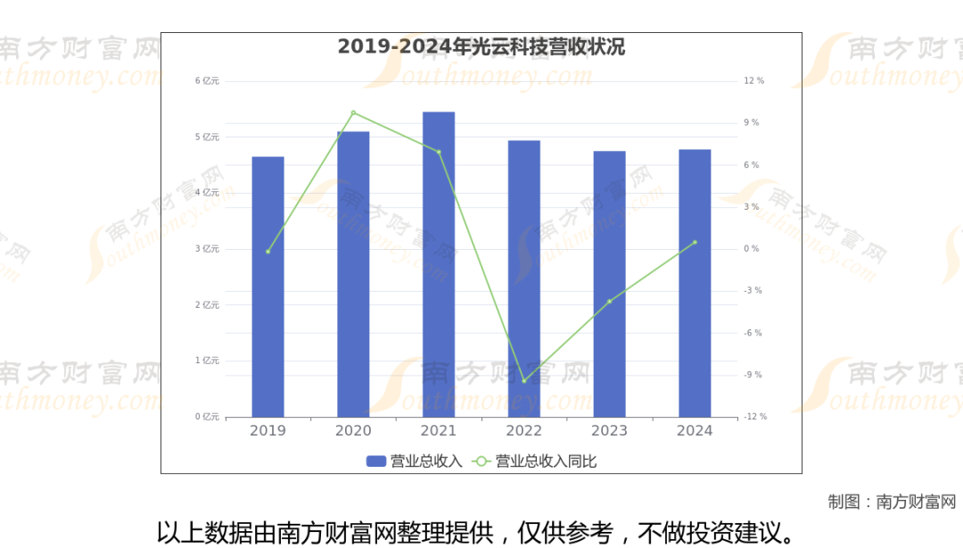 光云科技2024年数据显示(如上图),公司2024年营业收入4.78亿,同比增长0.49%,近五年复合年增长率-1.62%。