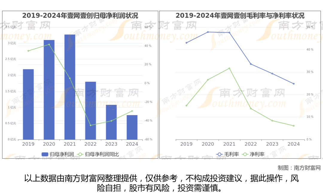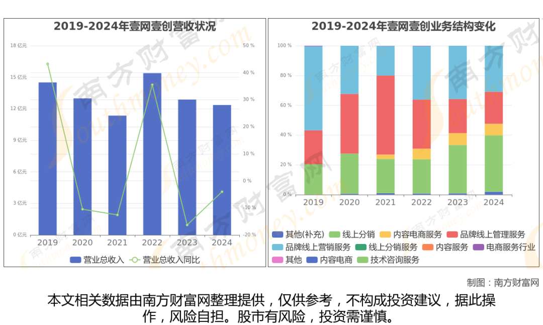 壹网壹创年报数据显示(如上图),2024年实现营业总收入12.36亿,同比增长-4.02%,近5年复合年增长率-1.23%。