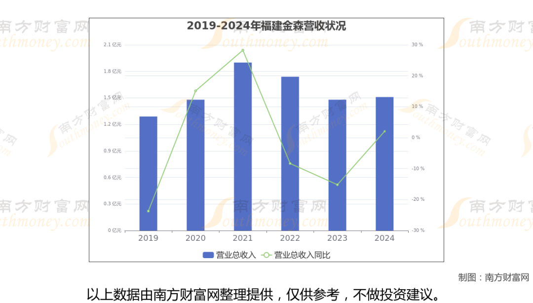 据年报数据显示(如上图),福建金森过去一年实现营业收入1.51亿,同比增长2.08%,近5年复合年增长率0.45%。