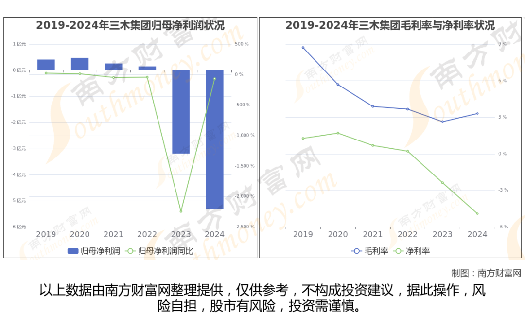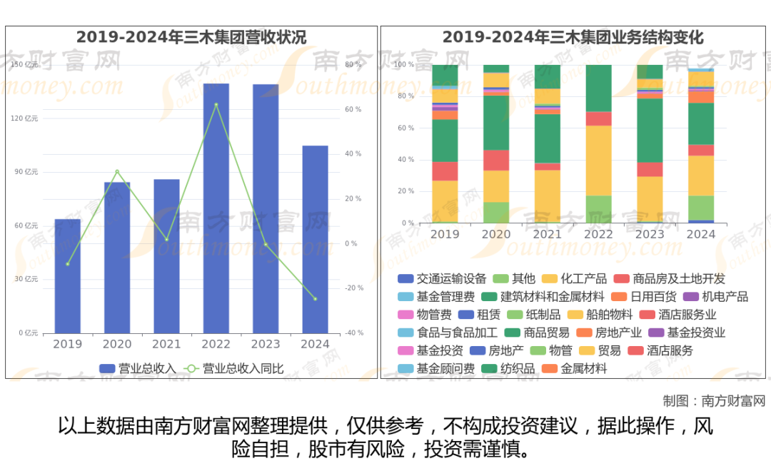 (如上图)2024年三木集团公司营业总收入为104.81亿,同比增长-24.66%,近5年复合增长率为5.57%。