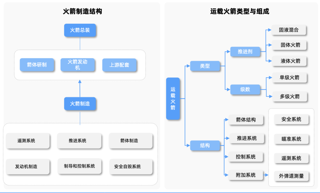 火箭系统主要包括推进系统、箭体制造、遥测系统、发动机制造、制导和控制系统以及安全自毁系统。