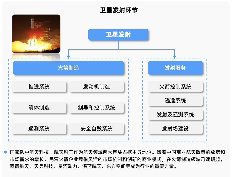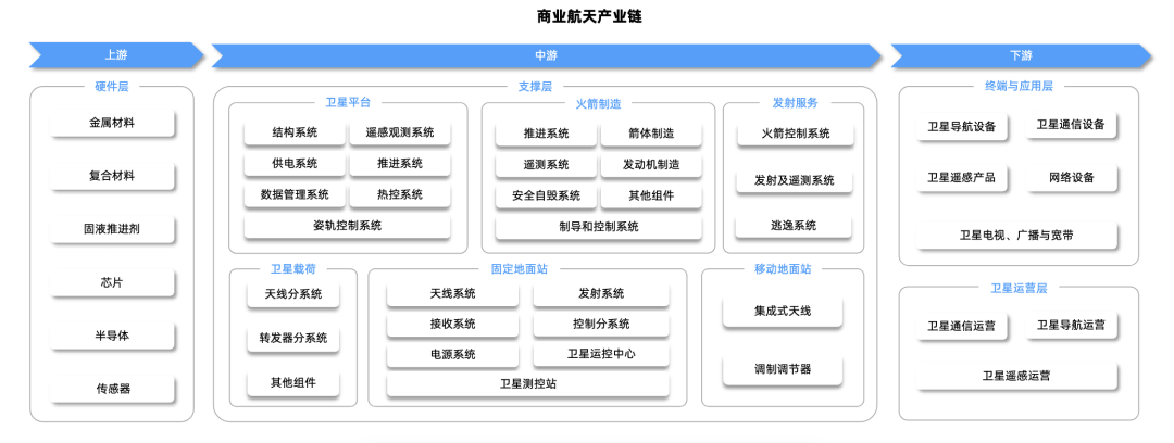 中游:涉及火箭制造、卫星制造、卫星发射服务以及地面设备的制造,是产业链中的核心部分,承载技术转化与产品实现的目标。