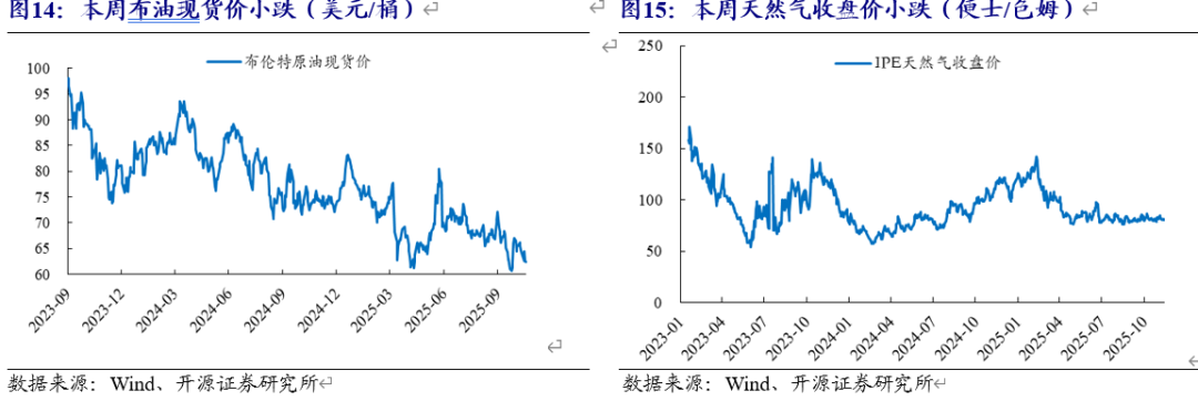 布油现货价小跌,天然气收盘价小跌。截至11月13日,布油现货价为62.34美元/桶,环比下跌1.69美元/桶,跌幅2.64%。截至11月13日,IPE天然气收盘价为80.14便士/色姆,环比下跌2.37便士/色姆,跌幅2.87%。