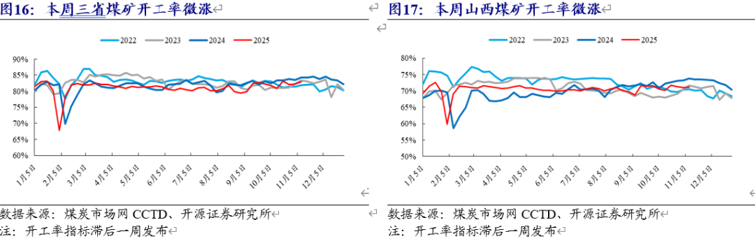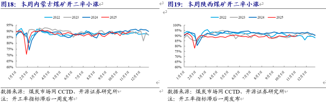 煤矿开工率微涨。截至11月9日,晋陕蒙三省442家煤矿开工率83%,环比上涨0.8个百分点;其中山西省煤矿开工率71.1%,环比上涨0.2个百分点;内蒙古煤矿开工率89.8%,环比上涨1个百分点;陕西省煤矿开工率90.3%,环比上涨1.3个百分点。