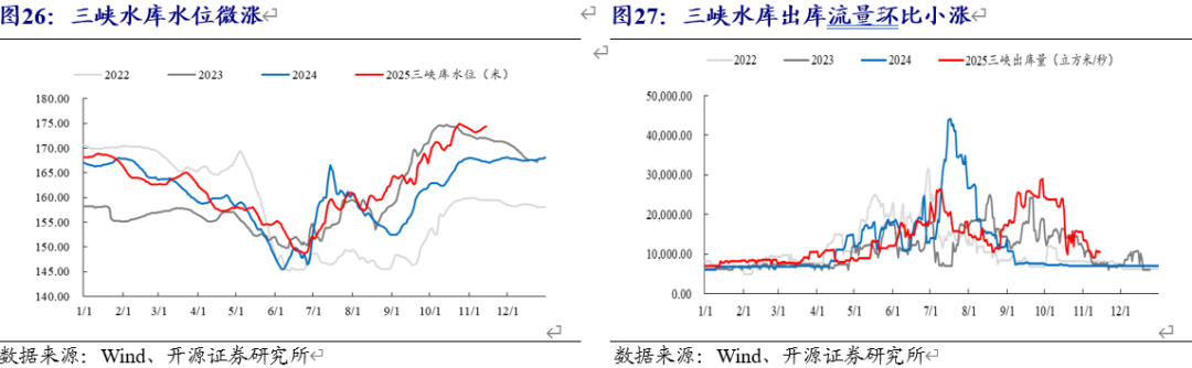 三峡水库水位微涨。截至11月14日,三峡水库水位174.42米,环比上涨1.05米,涨幅0.61%,同比上涨7.17米,涨幅4.29%。截至11月14日,三峡水库出库流量10500立方米/秒,环比上涨300立方米/秒,涨幅2.94%,同比上涨3540立方米/秒,涨幅50.86%。