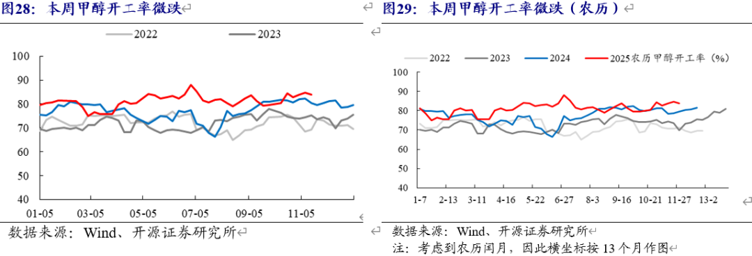 甲醇开工率微跌。截至11月13日,国内甲醇开工率83.9%,环比下跌0.7pct。