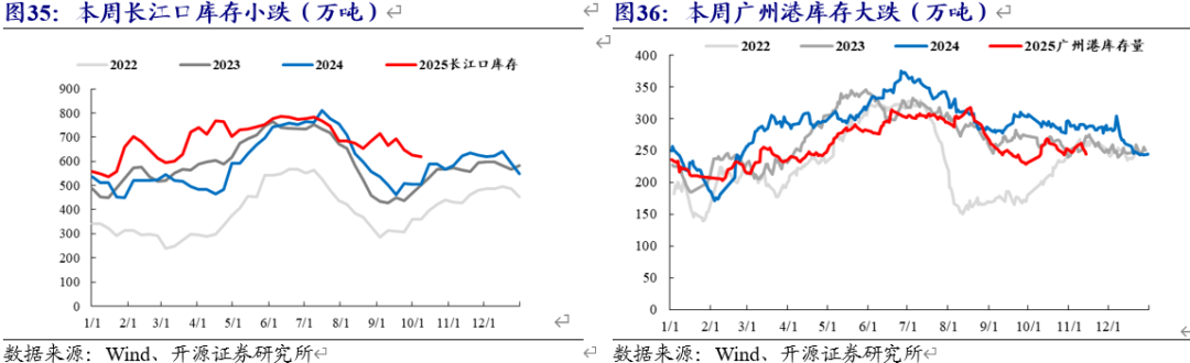 环渤海库存小涨。截至11月14日,环渤海库存2430万吨,环比上涨61万吨,涨幅2.56%,长江口库存小跌,广州港库存大跌。截至11月14日,长江口库存618万吨,环比下跌8万吨,跌幅1.28%;截至11月14日,广州港库存244万吨,环比下跌14万吨,跌幅5.47%。