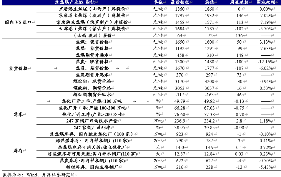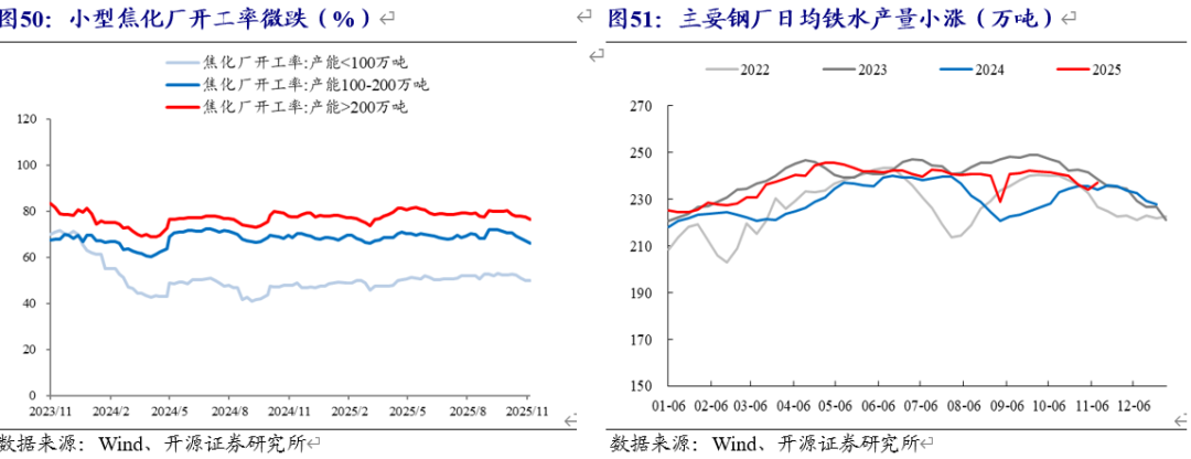 焦钢厂需求:小型焦化厂开工率微跌,日均铁水产量小涨,钢厂盈利率环比大跌