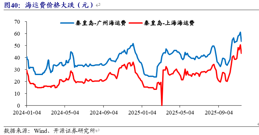 海运费大跌。截至11月14日,秦皇岛-广州运费53.5元/吨,环比下跌5.1元/吨,跌幅8.7%;秦皇岛-上海运费43.6元/吨,环比下跌2.9元/吨,跌幅6.24%。