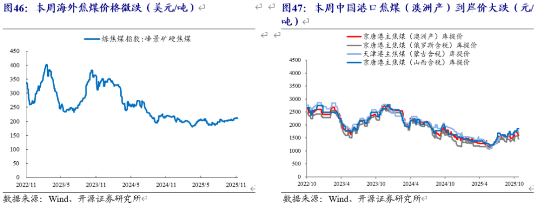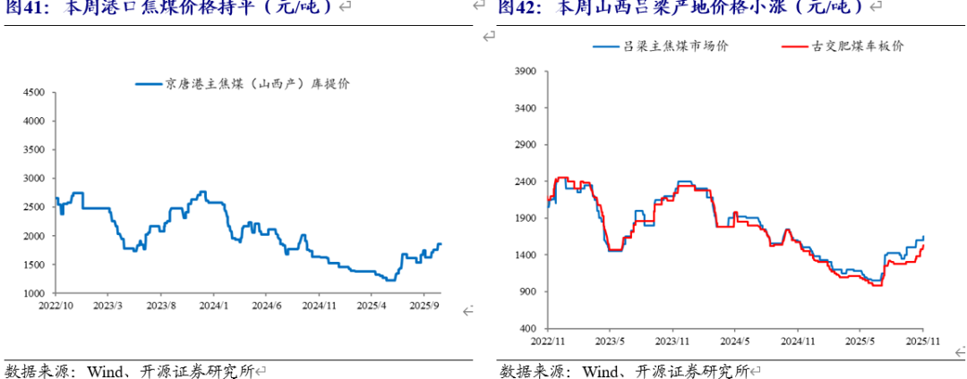 港口价格持平。截至11月14日,京唐港主焦煤报价1860元/吨,环比持平。