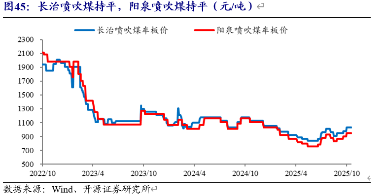 长治喷吹煤持平,阳泉喷吹煤持平。截至11月14日,长治喷吹煤车板价报价1030元/吨,环比持平;阳泉喷吹煤车板价报价950元/吨,环比持平。