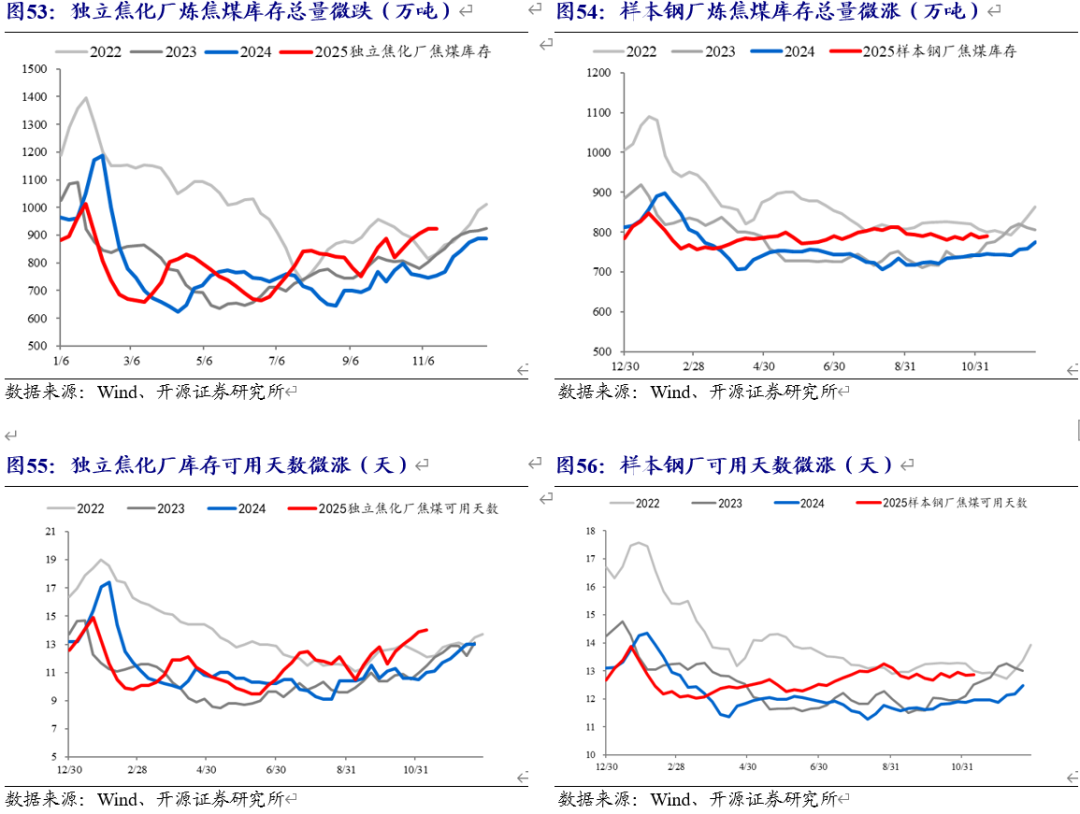 独立焦化厂库存可用天数微涨,样本钢厂可用天数微涨。截至11月14日,独立焦化厂炼焦煤库存可用天数14天,环比上涨0.1天,涨幅0.72%;国内样本钢厂(110家)炼焦煤库存可用天数12.87天,环比上涨0.03天,涨幅0.23%。