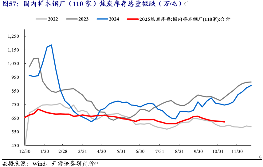 焦炭库存:国内样本钢厂(110家)焦炭库存总量微跌
