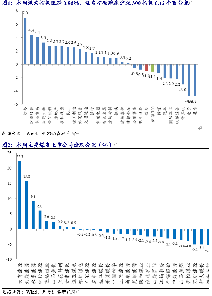 本周煤炭指数微跌0.96%,沪深300指数小跌1.08%,煤炭指数跑赢沪深300指数0.12个百分点。涨跌分化,涨幅前三名公司为:大有能源( 22.32%)、云煤能源( 15.77%)、永泰能源( 9.15%);跌幅前三名公司为:华阳股份(-6.17%)、潞安环能(-5.39%)、神火股份(-5.13%)。