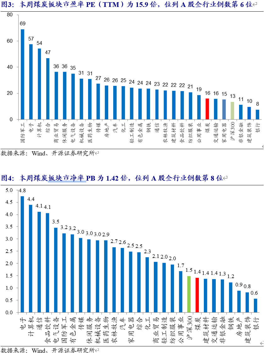 截至2025年11月14日,根据PE(TTM)剔除异常值(负值)后,煤炭板块平均市盈率PE为15.9倍,位列A股全行业倒数第6位;煤炭板块市净率PB为1.42倍,位列A股全行业倒数第八位。