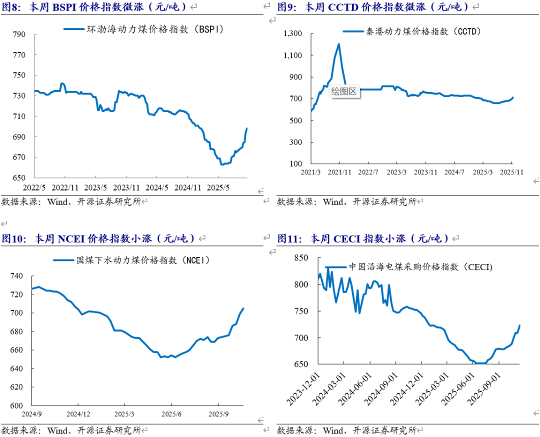 BSPI价格指数微涨,CCTD价格指数微涨,NCEI价格指数小涨,本周CECI指数小涨。截至11月12日,环渤海动力煤价格指数(BSPI)价格698元/吨,环比上涨4元/吨,涨幅0.58%;截至11月14日,CCTD秦港动力煤Q5500价格710元/吨,环比上涨7元/吨,涨幅1%;截至11月14日,NCEI下水动力煤指数705元/吨,环比上涨7元/吨,涨幅1%;截至11月14日,CECI中国沿海电煤采购价格指数723元/吨,环比上涨14元/吨,涨幅1.97%。