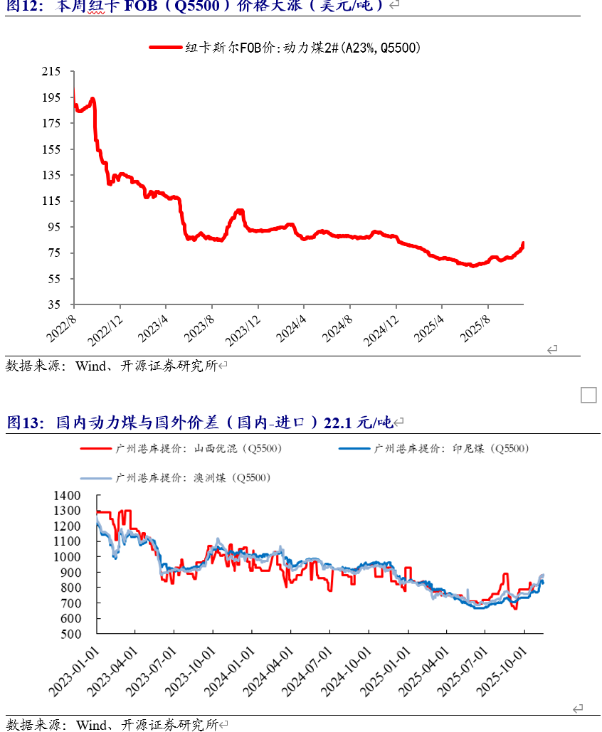 纽卡斯尔FOB(Q5500)大涨。截至11月13日,纽卡斯尔2#动力煤FOB报价82.5美元/吨,环比上涨4.5美元/吨,涨幅5.77%。