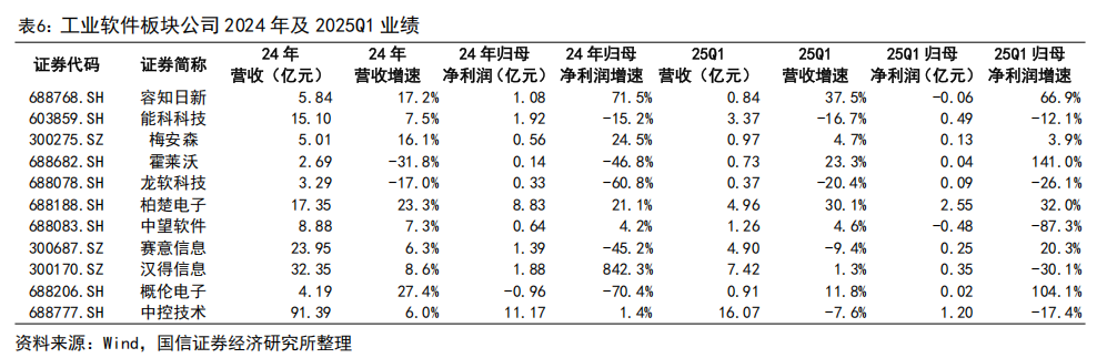工业软件板块。工业软件板块公司 2024 年收入整体保持增长,受市场需求波动、价格调整等因素影响,利润端表现承压。智能制造是工业领域发展趋势,油气储运、智慧矿山、新能源材料、生物基材料、机器人等快速发展的行业给自动化产品带来新的增长,2025 年板块有望随需求释放与技术创新实现利润修复。