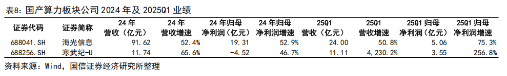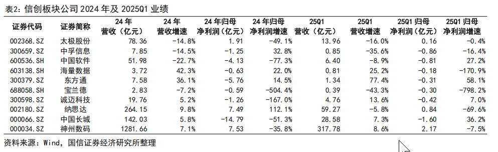信创板块。2024 年行业国产化替代在金融、电信的引领下,从外围系统向核心系统拓展。国产数据库提供商海量数据 2024 年收入同比增长 42.3%,2025 年一季度延续增长趋势。当前板块整体业绩提升仍需进一步政策支持与市场需求释放,以推动板块协调向好发展。