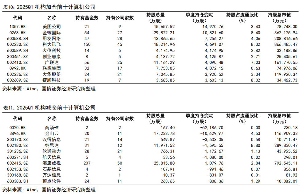 2025Q1 机构加仓前十大计算机公司为美图公司、金蝶国际、用友网络、科大讯飞、大位科技、创业慧康、广联达、联想集团、大华股份、捷顺科技;机构减仓前十计算机公司为商汤-W、金山云、汉得信息、纳思达、软通动力、航天信息、海康威视、石基信息、万达信息、顶点软件。
