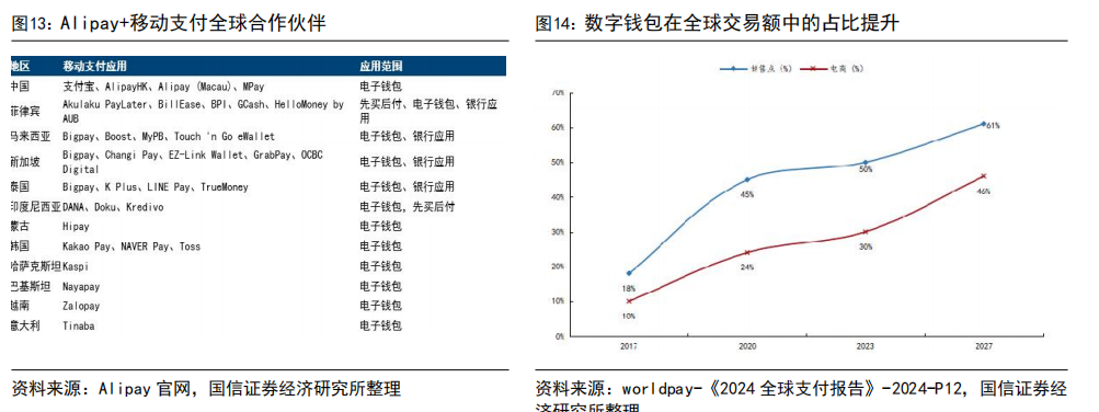中国积极参与全球移动支付竞争,产业链迎来出海机遇。近年来,中国数字支付市场份额相对稳定,支付宝、财付通占据较大市场份额。据 worldpay 预测,未来全球数字钱包占比将快速增加,预计 2027 年未来全球电商、线下数字钱包使用率将分别达 61%、46%,具有较大增长空间。2023 年中国数字钱包电商使用率约 80%(全球约 50%),线下销售点使用率约 66%(全球约 30%),处于全球领先地位,数字支付解决方案的成熟度相对较高,市场格局相对稳定。同时,支付宝和微信支付证明了二维码在推动数字支付普及中的作用,当前二维码支付模式在东南亚市场迅速发展,北美以及欧洲市场有望在未来跟进,中国支付企业在商业成熟度方面具有优势,推动支付出海成为支付机构业绩增长点。