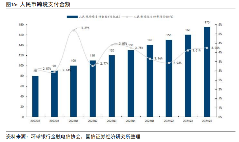 得益于政策支持、金融市场开放、技术创新及区域合作等多重因素,人民币国际地位逐步提升。据环球银行金融电信协会数据,2024 年 CIPS 处理人民币跨境支付金额达 175 万亿元,同比增长 43%,体现出人民币在全球结算与投融资中的接受度快速提升。人民币在全球金融体系中的地位亦持续提升,2024 年已成为全球第四大支付货币,国际支付市场份额达到 3.75%。同时,跨境收付金额达 64 万亿元,同比增长 23%,稳居全球第三大贸易融资货币。