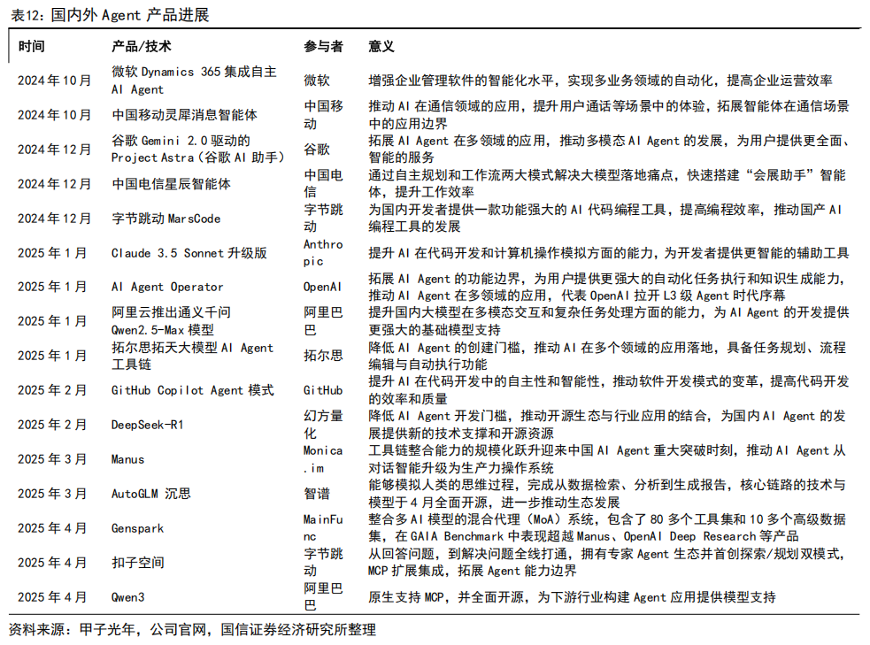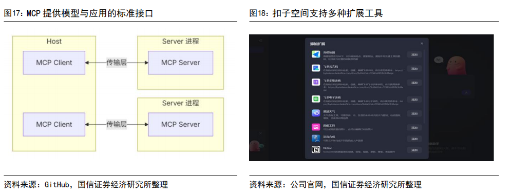 国内大厂纷纷布局 MCP,AI 能力边界持续拓展。4 月 9 日,百度智能云率先宣布千帆大模型平台接入集成 MCP。4 月 16 日,蚂蚁智能体平台百宝箱推出了 MCP 专区,全面支持各类 MCP 服务的部署和调用。4 月 18 日,腾讯全球数字生态大会成都峰会开幕,腾讯云智能区域解决方案总监王伟宣布,腾讯云大模型知识引擎已接入 MCP,用户可调用平台精选或自定义 MCP 插件搭建应用。随着字节、阿里正式推出支持 MCP 的 AI 产品,将刺激下游应用持续向 MCP 领域布局,MCP 有望成为 AI 时代的 HTTP 协议,可大幅提效 AI 应用开发、加速生态扩展。同时,字节跳动发布扣子空间,拉开了大厂布局通用 Agent 的序幕,阿里、腾讯等公司有望迅速推进,相关生态有望加速扩张。