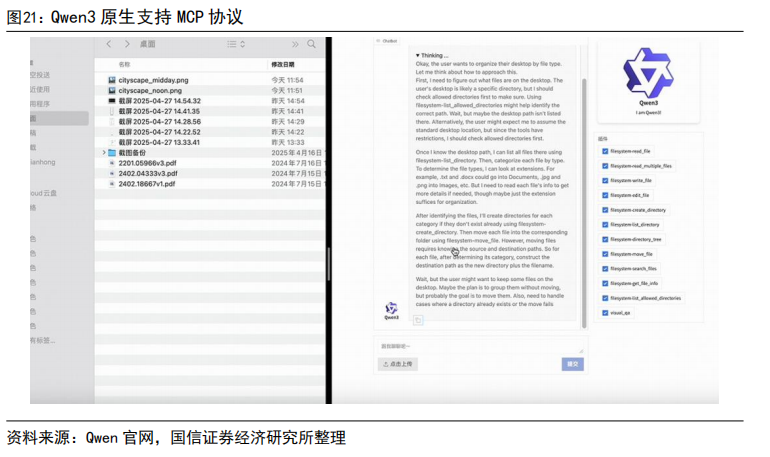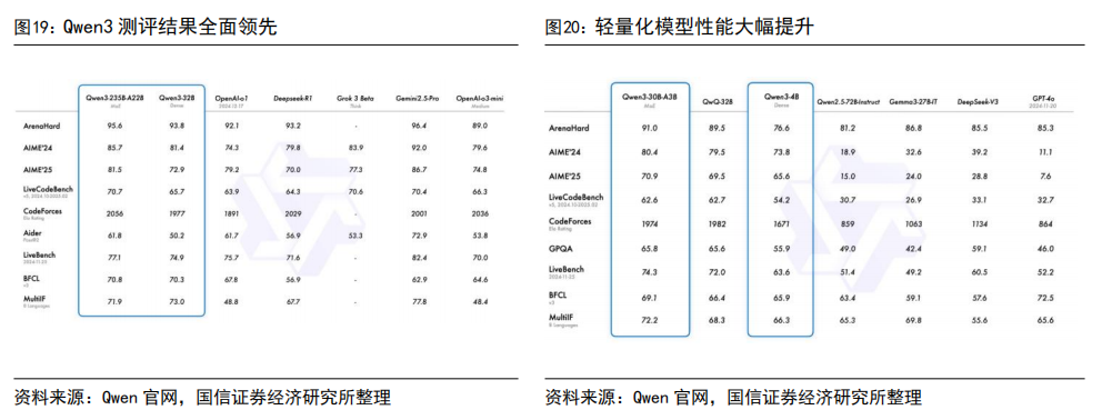 原生支持 MCP,为 Agent 落地提供模型基础。在官方测试中,Qwen3 在专门评估模型 Agent 能力的 BFCL 评测中刷新了榜单记录,以 70.8 的分数超越 DeepSeek-R1(56.9),也大幅超越了闭源模型 Gemini2.5-Pro。Qwen3 在 Agent 能力方面做了大量的优化,原生支持 MCP 协议,并具备强大的工具调用能力,结合封装了工具调用模板和工具调用解析器的 Qwen-Agent 框架,不再局限于传统的 ChatBot 问答对话视角,面向 Agent 化的任务型应用提供了模型层支撑。