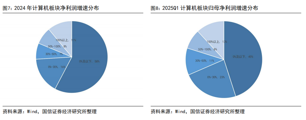 从业绩增长分布情况来看,2025Q1 计算机板块整体表现回暖,业绩增速 100%以上公司占比 12%,业绩增长 50%-100%的公司占比 8%,业绩增长 30%-50%的公司占比11%,业绩增长 0%-30%的公司占比 23%,业绩负增长的公司占比 45%。根据板块2024年净利润增速情况来看,业绩增速在 100%以上的公司占比 11%,业绩增速50%-100%的公司占比 8%,业绩增速 30%-50%的公司占比为 7%,业绩增速 0%-30%的公司占比16%。能够实现快速增长的公司集中在 IDC、行业专用软件、服务器等业务相关公司里,主要因为 AI 带来软件产品性能的全面提升,相关应用逐步渗透到垂类场景,以及大模型训练、推理规模扩大带动国产算力的需求。