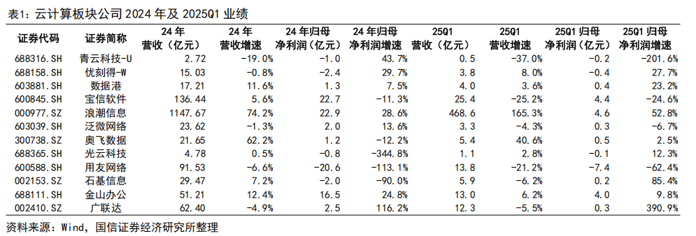 云计算板块。2024 年国产 AI 大模型快速发展,大型互联网客户的投资意愿逐步恢复,投资力度也逐步加大,IDC 服务商奥飞数据、服务器供货商浪潮信息业绩表现亮眼。2024 年奥飞数据营收增长 62.2%,核心收入来源 IDC 服务稳健增长,节能服务、光通信设备等新业务成为新增长点;浪潮信息营收增长 74.2%,受益于 AI 算力需求激增,服务器及部件收入占比超 99%。IDC、服务器等领域企业持续受益于基础设施需求增长,2025 年一季度延续良好发展态势。在 SaaS 领域,金山办公深耕 AI 应用,2024 年营业收入同比增长 12.4%,2025 年一季度延续增长态势。随着 AI 在各行各业得到更广泛的应用,企业对云的需求将逐步提升,云计算公司持续受益。