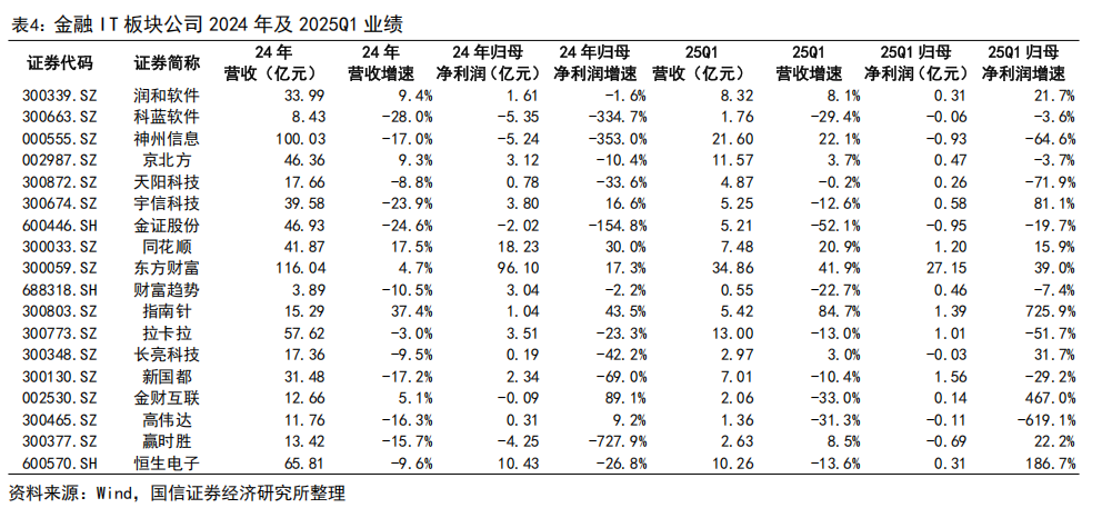 金融 IT 板块。2024 年金融 IT 同 AI 深度结合,多家公司发布相关产品。2024年东方财富、同花顺分别实现归母净利润 96.1、18.23 亿元,同比增长 17.3%、30%。银行 IT 方面,2024 年中国人民银行等七部门联合发布《推动数字金融高质量发展行动方案》,明确要求系统性推进金融机构加快数字化转型工程,为金融机构数字化转型提供了政策支撑。同时,金融机构持续加大在“AI 金融”领域的资源投入与产业化应用探索,AI 技术从局部试点向多维度应用场景的规模化落地阶段全面推进,有望推动板块下游需求提升。