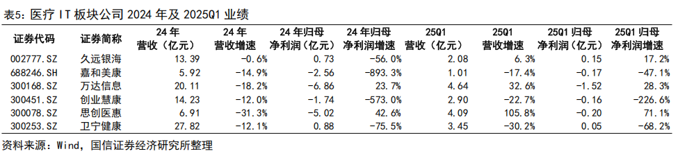 医疗 IT 板块。医疗 IT 板块公司 2024 年业绩整体承压,2024 年卫宁健康、思创医惠、创业慧康、嘉和美康、久远银海分别实现营业收入 27.82、6.91、14.23、5.92、13.39 亿元,同比-12.1%、-31.3%、-12.0%、-14.9%、-0.6%。2024 年,国家卫健委等部门发布《卫生健康行业人工智能应用场景参考指引》,明确 4 类共 84 个场景,推动 AI 应用快速向大健康领域渗透,产业发展有望进入加速期。
