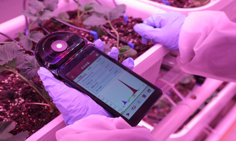 欧普智莓团队成员在植物工厂内,利用植物光照分析仪采集关键数据。陆云波摄