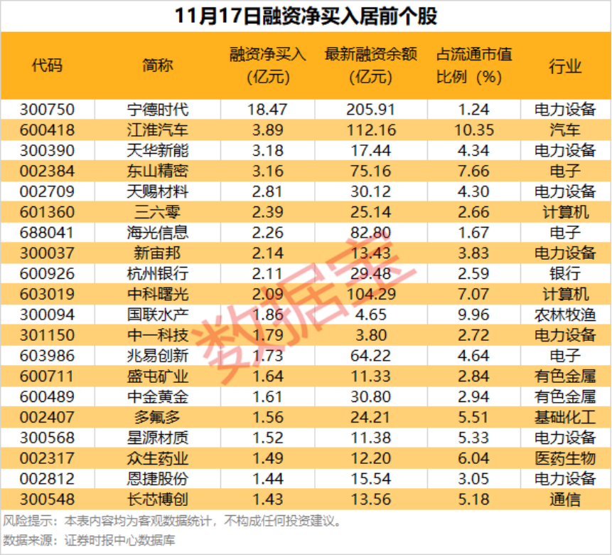 具体到个股,11月17日获融资净买入1亿元以上的有35只,其中,10只融资净买入额超亿元。宁德时代融资净买入额居首,当日净买入18.47亿元;其次是江淮汽车、天华新能,融资净买入金额分别为3.89亿元、3.18亿元;融资净买入金额居前的还有东山精密、天赐材料、三六零等。