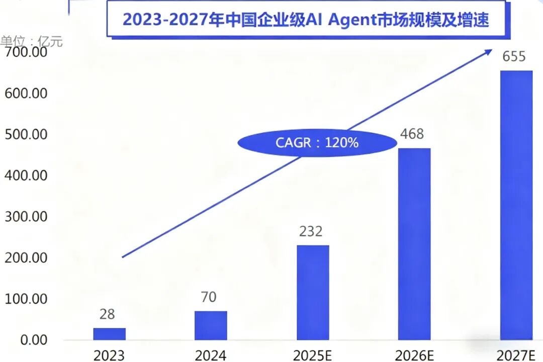 根据第一新声智库,2025年中国企业级AIAgent市场规模将达到232亿元。2023-2027年中国企业级AI Agent市场规模复合增长率将达到120%,至2027年,企业级 Agent市场规模将达到655亿元。